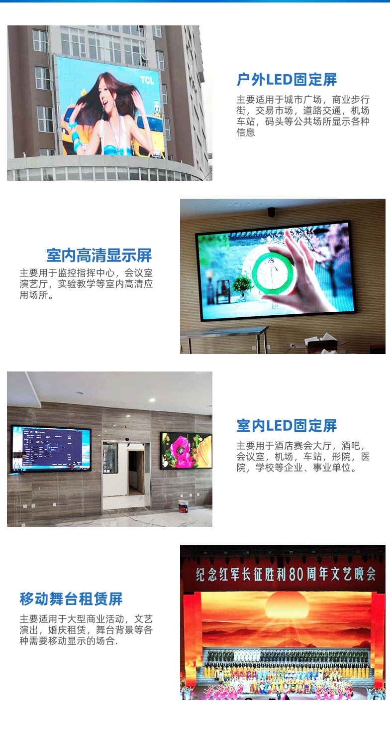 無拼縫、超寬視角,亮度色度均勻不偏色 畫質(zhì)柔和,長時間觀看不疲勞 超高刷新顯示,換幀速度快,消除重影無拖尾 箱體靈活小巧,對準槽+定位銷設(shè)計,確保屏體平整無縫 16bit灰度處理處理,色彩過度更自然 具有靈活、輕便、易于安裝和維護的特點。 廣泛應(yīng)用于商場、企業(yè)、學(xué)校、舞臺、銀行、證券、公共安全、交通、醫(yī)院、公園、機場、車站、安防、電視臺等領(lǐng)域。